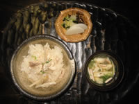 ・姫慈姑旨煮 ・地物蝦蛄チーズ焼き ・白葱しゃも地鶏藻塩 ・茶ぶり生子 ・岩国蓮根揚げ ・湯来こんにゃくきんぴら ・青菜平貝たらこ和え ・地物椎茸胡麻和え