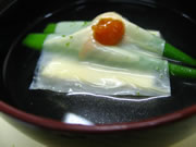 | 小鉢 | 地物アスパラ浅利のゼリー掛け 山葵 蟹 | |||