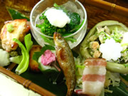 | 前菜 | ・長芋きんとん桜葉巻き(廿日市) ・炭火ベーコン(北海道) ・湯来ちょうざめ西京焼き ・舞茸びたし(吉和) ・しゃも地鶏山葵(神石) ・青菜白和え(廿日市) ・ホンモロコ藻潮(鳥取) ・鯛皮、子ポン酢おろし | |||
