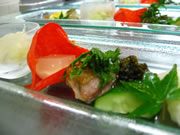| 前菜 | ・天日干しちりめん(愛媛) ・もみじ豚和からし(広島) ・鱧子ゼリー寄せ(瀬戸内海) ・じゃが芋団子(廿日市) ・こんにゃく梅かつお(湯来) ・しゃも地鶏ポン酢(神石) ・穴子昆布巻き(瀬戸内海) ・焼き人参(廿日市) | |||