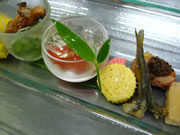 | 前菜 | ・トマトのジュレ(廿日市) ・小鰯唐揚(広島) ・穴子と胡瓜(瀬戸内海) ・もみじ豚とトマト(広島) ・地鶏卵だし巻き(きなり村) ・鱧子ゼリー寄せ(瀬戸内海) ・しゃも地鶏葱味噌(神石) ・とうもろこし(廿日市) ・赤かぶ、ズッキーニなど(きなり村) | |||