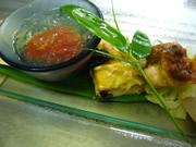 | 前菜 | ・トマトのジュレ(廿日市) ・しゃも地鶏葱味噌(神石) ・油あげの寿し(奥出雲) ・姫栄螺(瀬戸内海) ・夏野菜のキッシュ風(廿日市) ・こんにゃく白和え(湯来) ・大根ゼリー寄せ(廿日市) ・胡瓜胡麻和え(廿日市) ・小鰯梅酒煮(広島) ・豆腐の味噌漬(奥出雲) | |||