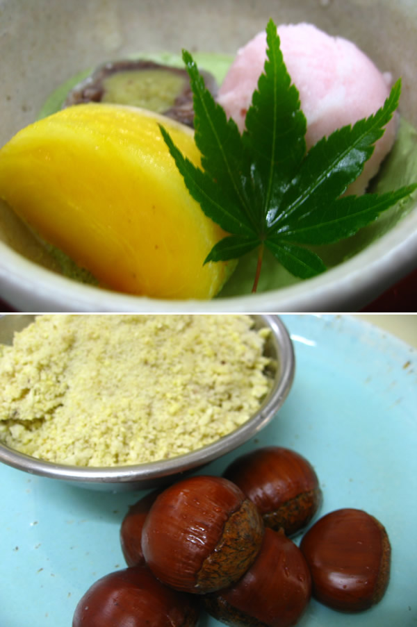 今月は、・栗と小倉の求肥巻き、・抹茶ムース、・アイスクリームの3点盛り合わせです。