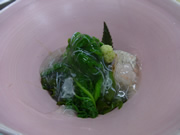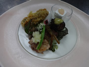 | 前菜 | ・春キャベツからし和え(廿日市) ・姫さざえ木の芽味噌(瀬戸内海) ・ホンモロコ梅肉(湯来) ・広島ハーブ鶏塩焼(三原) ・酒粕ムース(呉) ・岡村牧場豚蕗味噌(廿日市) ・椎茸煮付(廿日市) ・こごみ胡麻まぶし(西石見) ・牡蠣フライ奈良漬(地御前) ・菜花和え物(廿日市) | |||