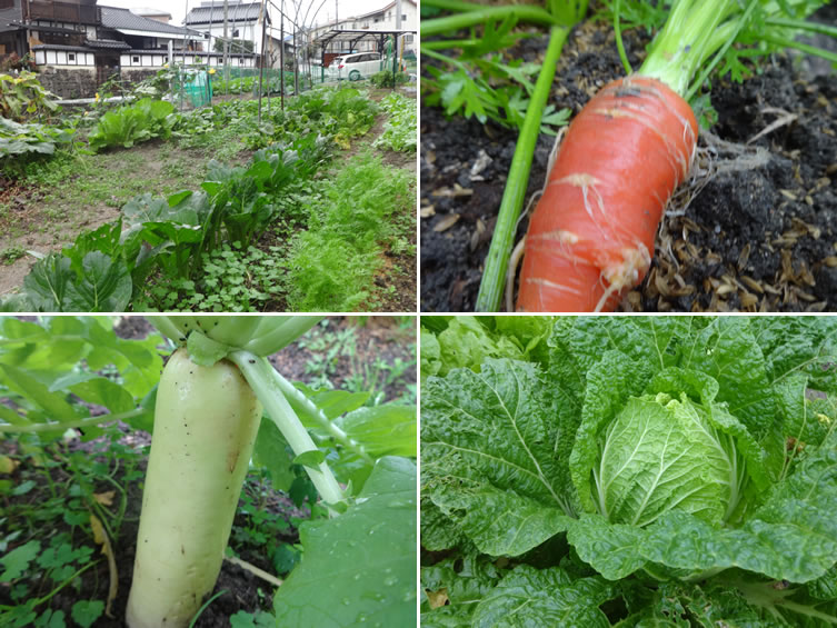蔵農園「秋」・「冬」野菜、元気に育っています。 秋から冬へ寒さが厳しくなると、野菜の甘味、旨味が増して、とてもおいしくなります。 蔵農園では、白菜、金時人参、たか菜、水菜、大根、里芋、いんげん、小松菜、レタスなどてんこ盛り。 朝採り新鮮野菜をお客様へ。