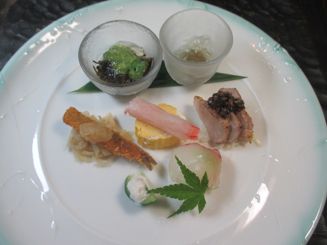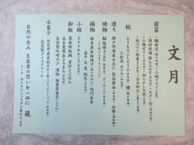 ・鯛寿司(瀬戸内海) ・小鰯フライ(広島) ・岡村牧場豚もろみそ(廿日市) ・もずく酢(隠岐の島) ・小梅ゼリー(廿日市) ・切り干し大根(広島) ・紅ズワイ絹巻き(鳥取) ・お米卵だし巻き(世羅)