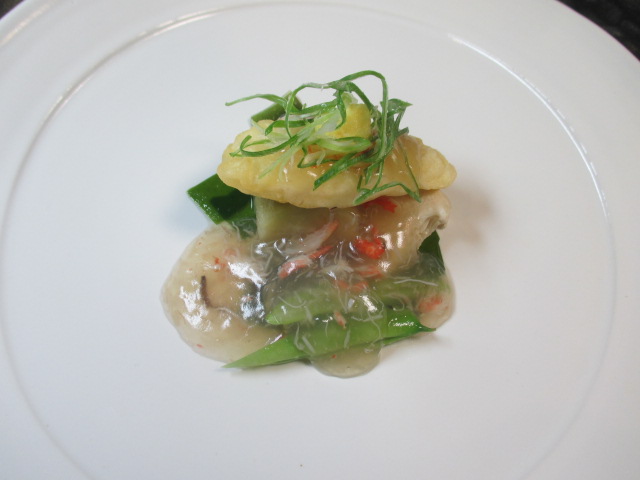 白身魚米粉揚げ(瀬戸内海他) 鳴門若布 茄子 豆 葱 鮑茸(廿日市)