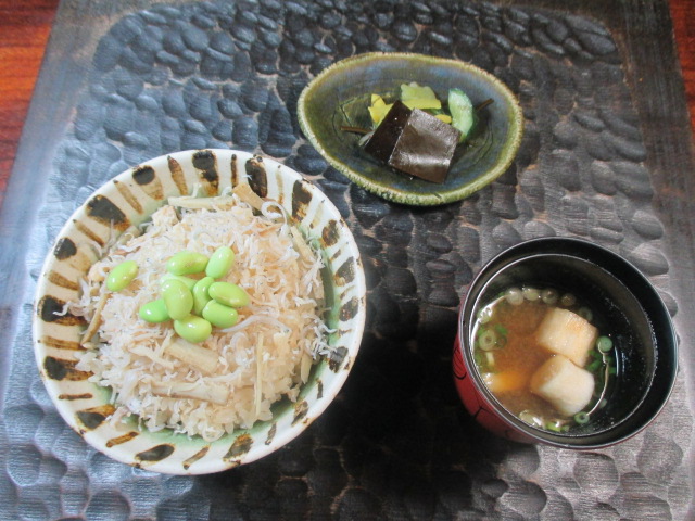 黒楽御飯鍋 釜炊きごはん 永本農園あきろまん(廿日市) 自家製味噌の汁 漬物 無農薬番茶(上下町)