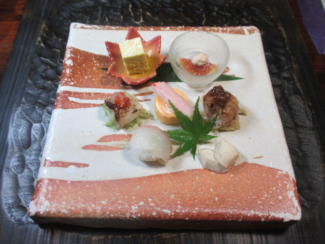 ・手毬寿司(瀬戸内海) ・栗ムース(廿日市) ・岡村牧場豚団子(廿日市) ・ちりめんだし巻き(愛媛) ・銀山赤どり西京焼き(大田市) ・鮑茸胡麻和え(廿日市) ・無花果きなこ酢(広島) ・紅ズワイ絹巻き(鳥取)