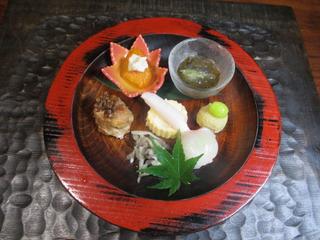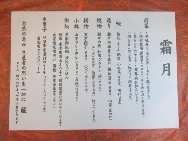 ・手毬寿司(瀬戸内海) ・もずく酢(隠岐の島) ・岡村牧場豚団子(廿日市) ・ちりめんだし巻き(愛媛) ・栗きんとん(廿日市) ・舞茸胡麻和え(廿日市) ・柿きなこ酢(広島) ・紅ズワイ絹巻き(鳥取)