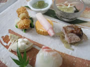 | 前菜 | ・手毬寿司(瀬戸内海) ・栗ムース(廿日市) ・岡村牧場豚団子(廿日市) ・ちりめんだし巻き(愛媛) ・銀山赤どり西京焼き(大田市) ・鮑茸胡麻和え(廿日市) ・無花果きなこ酢(広島) ・紅ズワイ絹巻き(鳥取) | |||