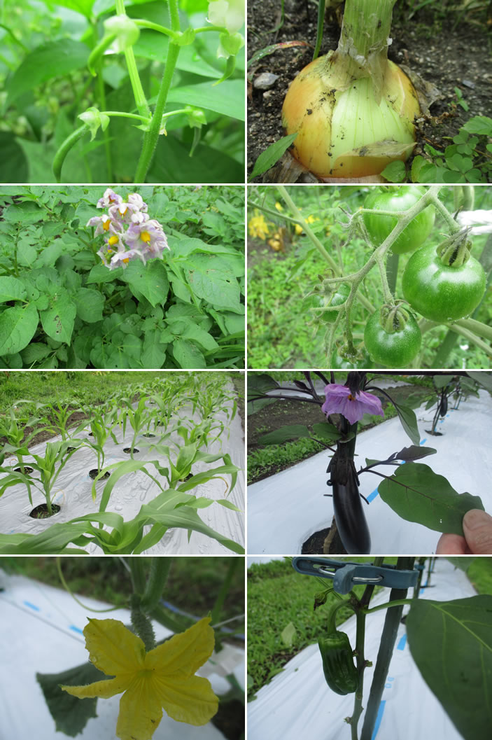 きゅうり、オクラ、トマト、なす、とうもろこし、じゃがいも、たまねぎ、いんげん、すくすく無農薬で育っております。