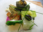 | 前菜 | ・牡蠣蕗味噌(地御前) ・ブロッコリー豆腐(柿の木村) ・菜の花胡麻和え(廿日市) ・しゃも地鶏藻塩(神石) ・こんにゃく寿し(湯来) ・姫栄螺(山陰) ・舞茸昆布和え(吉和) ・鯛ゼリー寄せ(瀬戸内海) | |||