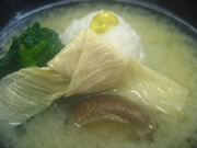| 椀 | 白味噌仕立(京都) 鯛真薯(瀬戸内海) 丸大根(廿日市) 椎茸(廿日市) 春菊(廿日市) 結び湯葉(京都) | |||
