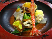 | 前菜 | ・揚げ栗(柿の木村) ・しゃも地鶏団子(神石) ・穴子と奈良漬(廿日市) ・柿きなこ酢(広島・他) ・湯来こんにゃくかつお梅 ・鯧西京焼き(瀬戸内海) ・青菜胡麻和え(廿日市) ・さつまいもレモン煮(廿日市) ・車海老(鹿児島) | |||