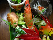 | 前菜 | ・地御前牡蠣蕗みそ ・鰆柚香焼き(瀬戸内海) ・姫栄螺(山陰) ・鯛皮とゲソポン酢おろし ・長芋とろろ(廿日市) ・菜の花和え物(廿日市) ・車海老昆布巻き(鹿児島他) ・舞茸びたし(吉和) | |||