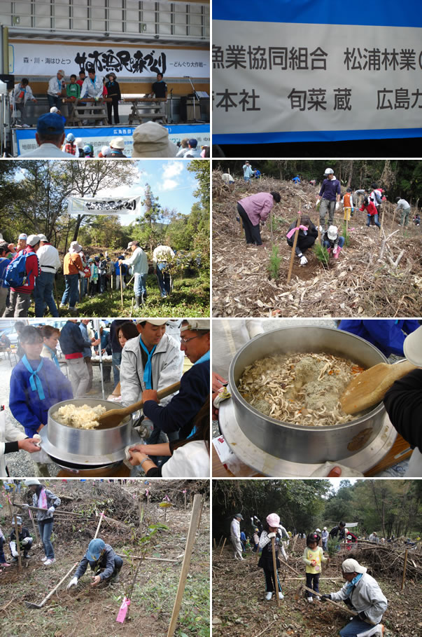 「森・川・海は一つ」をテーマに広島西部ロハスの会、地御前漁業協同組合が中心に植林がおこなわれ、子供70人をはじめ、230人が参加しました。